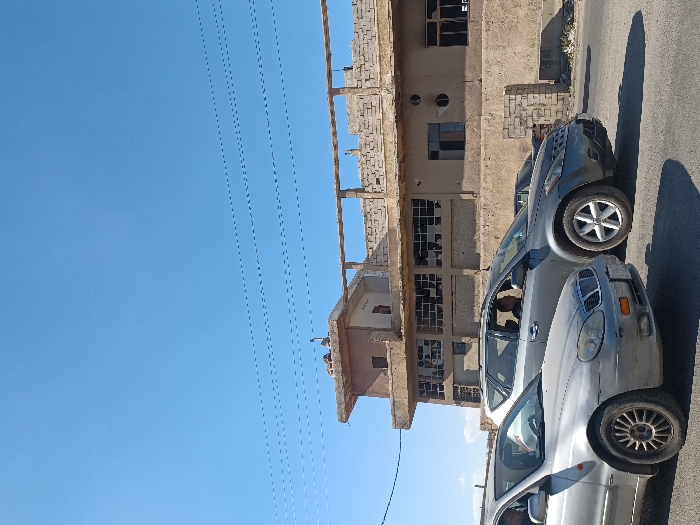 This image depicts a daytime street scene in As-Sabina, Syria. In the foreground, a silver sedan is positioned on the left side of an asphalt road, with the driver's head partially visible. To its right, a dark gray SUV is aligned slightly behind, with its driver distinctly visible facing forward. Both vehicles appear to be stopped or moving slowly, oriented towards the right side of the frame. The background features a multi-story, light-colored concrete building exhibiting significant structural disrepair. Most window openings on the ground and first floors are empty or contain shattered glass, and the facade shows signs of damage, including potential impact marks. An upper floor includes a balcony with a concrete railing. Multiple black utility lines extend horizontally across the clear blue sky above the building.