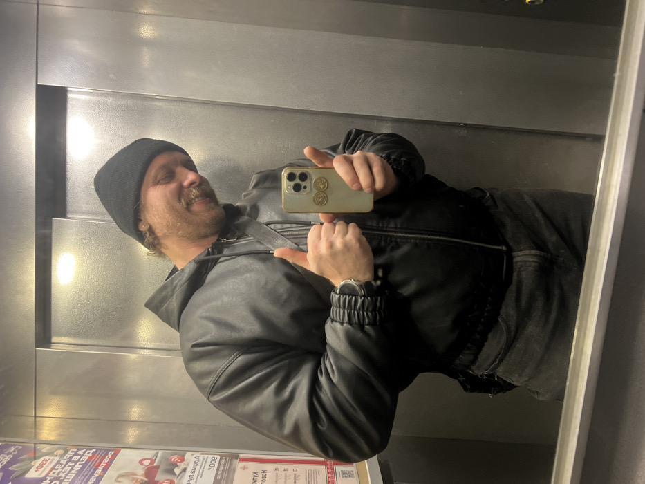 An adult male is depicted in a mirror selfie taken inside an elevator located in Murino, Russia