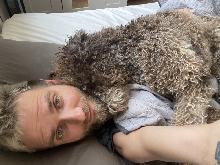 The image depicts an indoor scene within a bedroom in Budva, Montenegro. An adult male is positioned on his back, oriented towards the camera with his head tilted slightly to the right. He possesses light-colored hair, a short beard, and blue eyes, and exhibits a faint smile. A dark-colored top is visible around his neck and left shoulder. His right forearm is visible, resting underneath a gray quilted blanket, and features a partially visible dark tattoo near the wrist. A large dog with dense, curly, multi-toned brown and beige fur is resting on the man's chest and upper torso, obscuring much of its body. The man and dog are situated on a bed covered with white sheets and gray bedding. The background reveals a white headboard or wall, and a reflection in a mirror shows what appears to be wooden flooring and a white wall or doorframe.