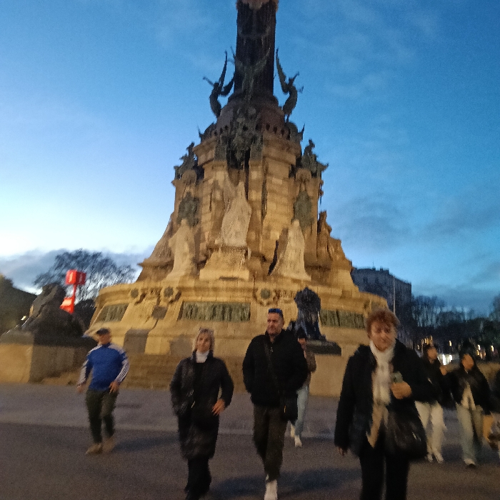A nighttime shot reveals a large monument with elaborate sculptures and figures. Several people are walking around the base of the monument. A man in a blue jacket and khaki pants walks to the left. Two women in dark coats and a man in a black jacket walk in the middle. Two more women also in dark coats walk to the right side. The sky is a blue-gray, suggesting dusk.