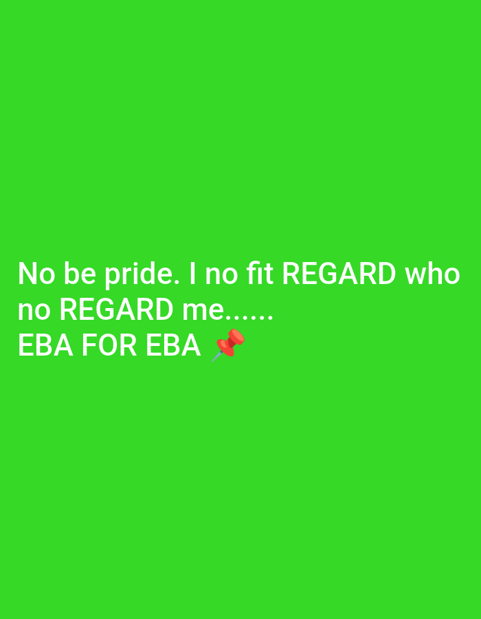 A digital image with a solid green background displays white text and a single red thumbtack icon. The text is centrally positioned towards the bottom of the frame and reads: "No be pride. I no fit REGARD who no REGARD me....... EBA FOR EBA". The word "REGARD" is capitalized three times, and the phrase "EBA FOR EBA" is fully capitalized. A red thumbtack icon, rendered with a light gray pin, is located to the right of the word "EBA". No individuals, physical structures, or other objects are depicted. The scene is a digital graphic presented in the city of Zawan, Nigeria.