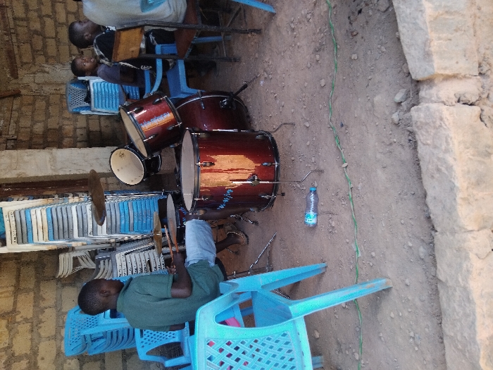 A man plays a brown drum set outdoors, seated on a light blue plastic chair. Additional blue plastic chairs are stacked nearby. Other individuals sit on blue chairs in the background. A clear plastic water bottle lies on the ground next to the drum set. A green cord runs along the dirt ground. The scene appears to be beside a white stone wall.