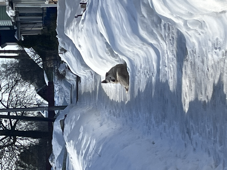 The image presents a sunlit winter scene in the city of Раздолье, Russia. A narrow, cleared pathway, exhibiting areas of both sunlight and shadow, extends from the foreground into the distance, flanked by substantial snowdrifts on either side. In the midground, a medium-sized dog with light-colored fur is seated on the pathway. The dog faces away from the viewer but has its head turned sharply to look back over its left shoulder. In the background, to the left, bare deciduous trees and a utility pole are visible against a bright sky, along with a distant building featuring a dark red roof. To the right, a portion of a light green wooden house with white window frames and a blue section is visible beyond the snowdrifts. No people are present.