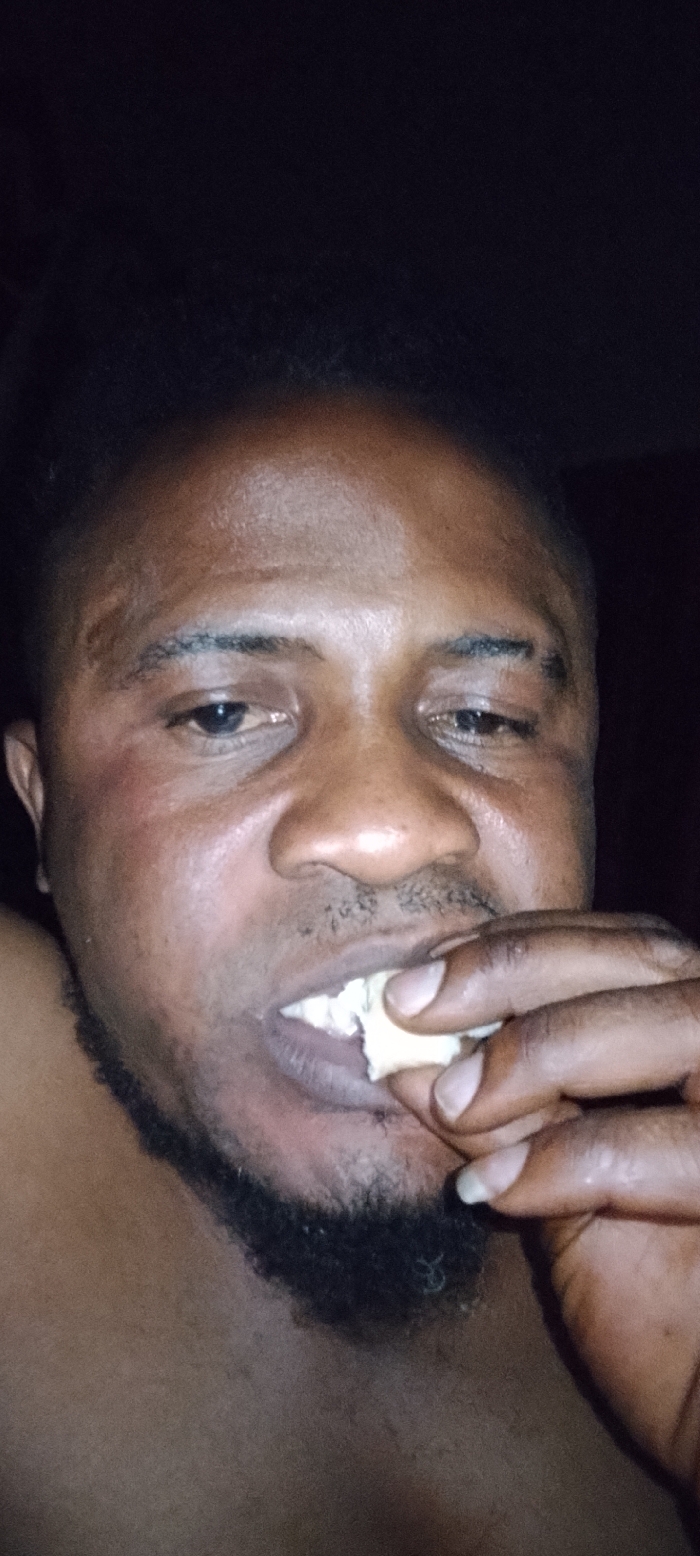 The image displays a close-up portrait of an adult male with dark skin, approximately in his 30s to 40s. He has short, dark, curly hair and a dark, short beard/goatee. His eyes are open, looking directly towards the camera. The man is captured in the act of consuming a light-colored, irregular-shaped food item, which he holds to his mouth with his right hand. His teeth are visible, engaged with the food. The background is uniformly dark, providing no discernible features or architectural details, suggesting a dimly lit indoor environment or an undifferentiated dark surface behind the subject. No specific location within a city can be determined from the visual information provided.