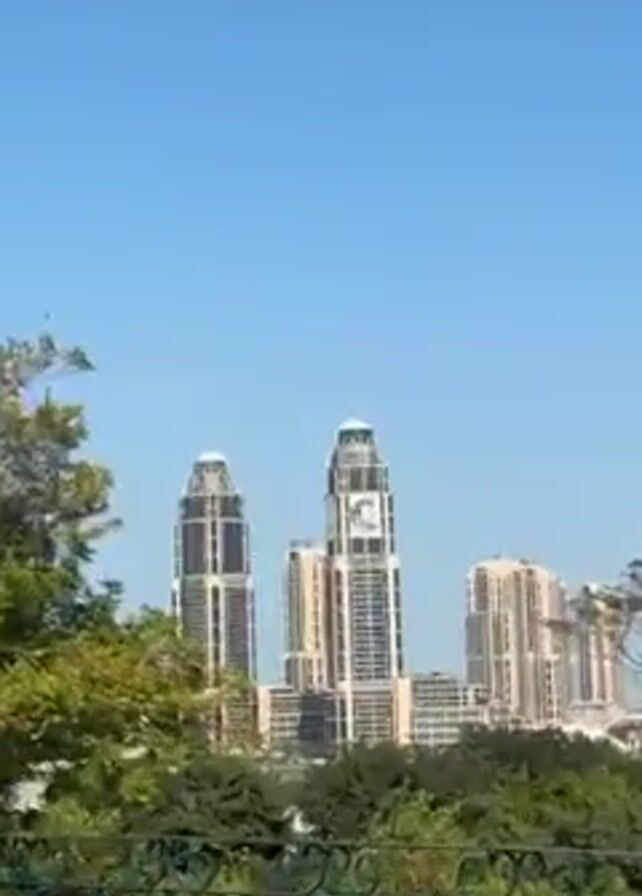 cityscape with several modern high-rise buildings visible in the background. A tall building is prominently featured with a portrait of a man displayed on its facade. In the foreground, there is an outdoor seating area, likely a restaurant or cafe, with tables and chairs arranged. Green trees and lawns partially obscure the view of the buildings from the seating area, suggesting the venue overlooks a park or garden. People can be seen walking or working in the park below. The sky is clear and blue.