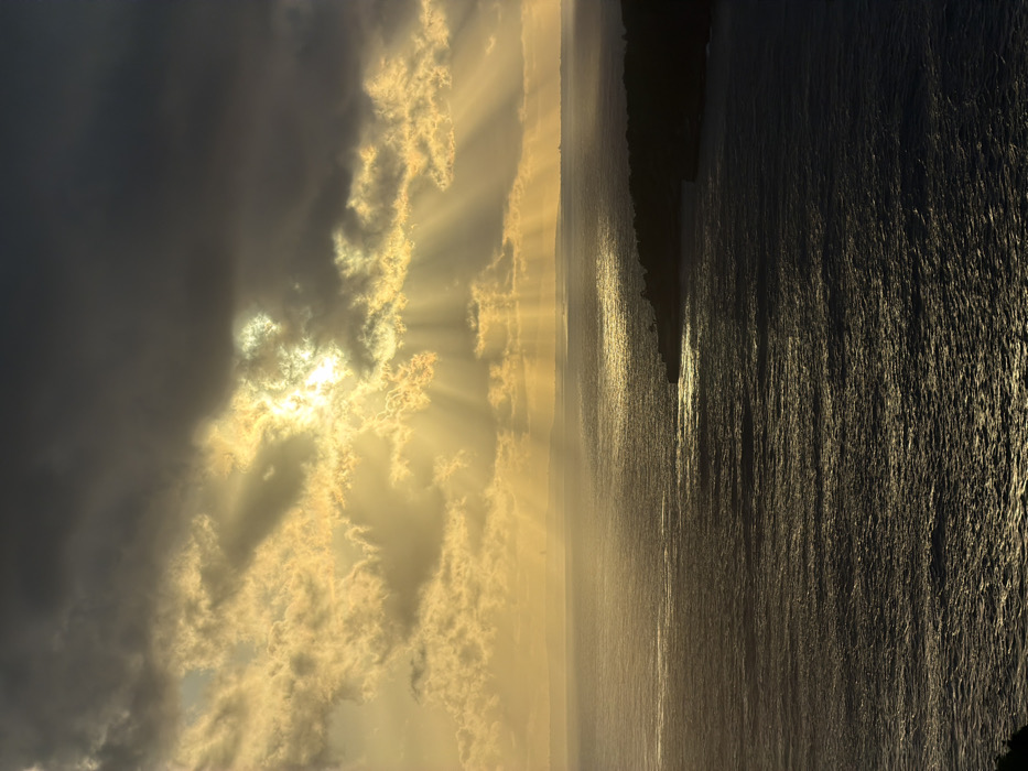 The image displays a panoramic coastal landscape, identified as being in Sakti, Indonesia. The upper half of the frame is occupied by a dramatic sky featuring heavy, dark grey clouds. A bright, obscured sun emits numerous distinct golden crepuscular rays that penetrate the clouds and extend downwards, illuminating the upper-central and upper-left portions of the sky with intense golden light. Below the horizon, a vast expanse of dark, choppy ocean water fills the mid-ground and foreground, reflecting pockets of the golden sunlight on its surface. To the lower-right, a dark, silhouetted landmass, appearing as a vegetated coastline or island, extends into the water, forming a natural curve or cove. A faint, distant landmass or atmospheric haze is visible along the far horizon line. No people, structures, or explicit actions are discernible.