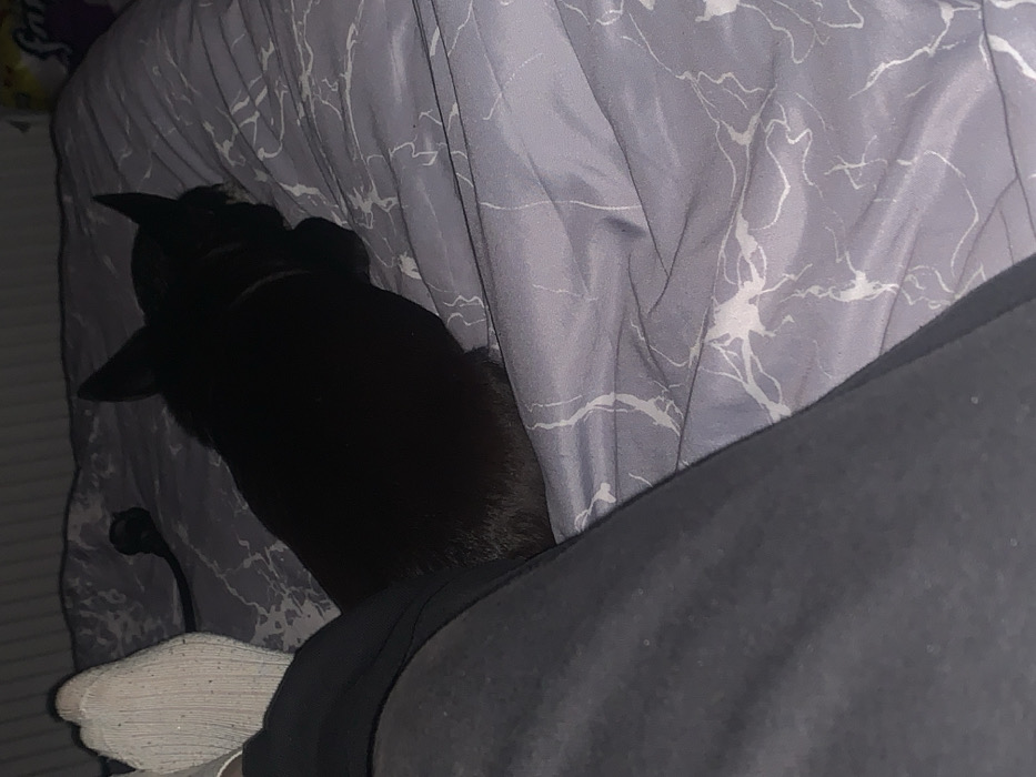 A dimly lit indoor scene in Lehchevo, Bulgaria, displays a black, short-haired dog resting on a bed. The dog, possibly a French Bulldog given its build and erect ears, is positioned on the right side of the frame, facing right, with its back partially towards the viewer. The bed is covered with grey bedding featuring irregular white vein-like patterns. To the left, a human left lower leg and foot are visible. The foot is encased in a light-colored, possibly off-white, ribbed sock, showing minor dark particulate matter. The leg is covered by dark grey fabric trousers. A thin, dark cable or cord is visible on the bed surface behind the dog's head.
