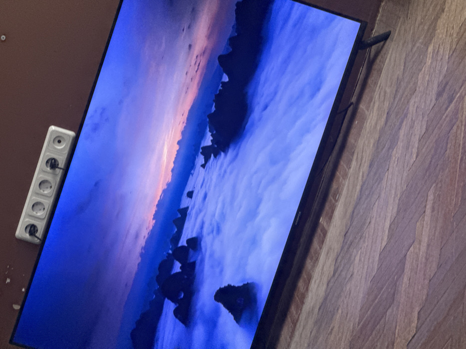 The scene depicts an interior space in Podolsk, Russia. A modern flat-screen television, featuring a faint "SHARP" logo on its bottom bezel, occupies the center of the frame, angled slightly to the right. The television screen displays a vibrant landscape image: dark, conical mountains emerge from a sea of white, low-lying clouds, under a sky gradient from deep blue to purple-pink at the horizon. The television rests on two dark, slender legs directly on a wooden floor, which is composed of medium-brown planks arranged in a herringbone pattern. Above the television, a white five-outlet power strip, configured for European (Schuko) plugs, is attached horizontally to a light brown wall. Two black electrical plugs are inserted into the two leftmost outlets of this power strip. No individuals or animals are present in the image.