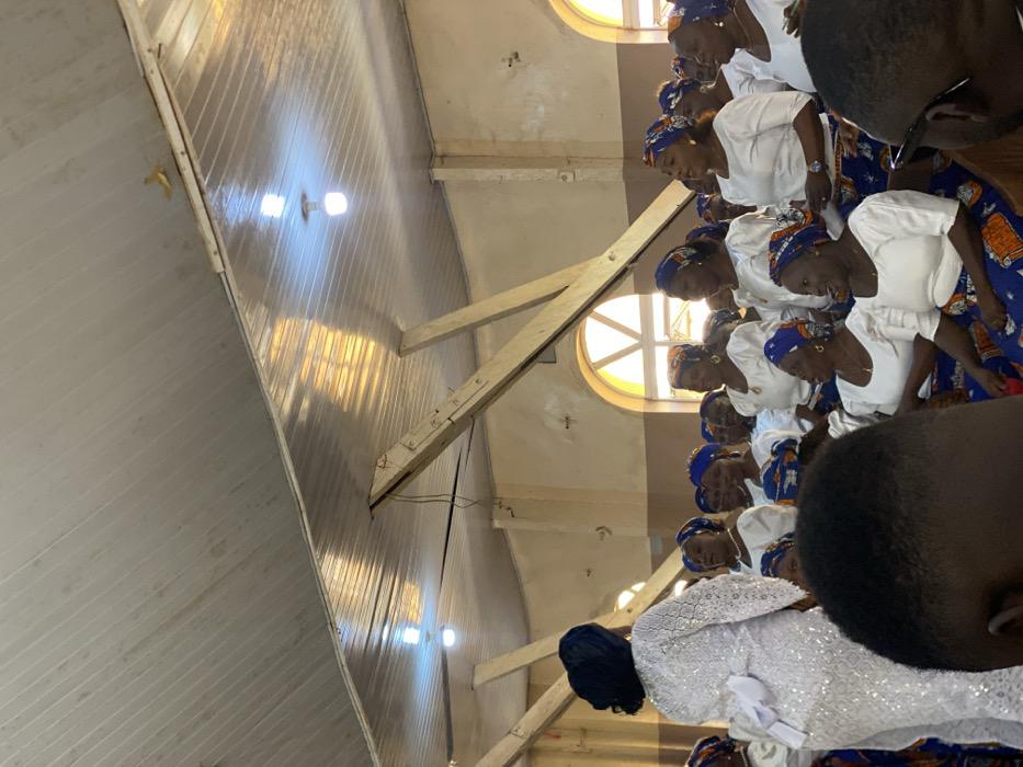 The image captures an indoor gathering within a large hall, likely a church or community center, located in Jos, Nigeria