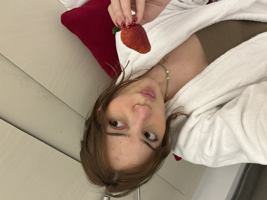 A woman lying down in a white robe holds a strawberry in her hand. She has fair skin, brown hair, and a necklace with small charms. A red pillow is visible behind her head. She appears to be in a bathroom or bedroom setting. The image is taken from a slightly overhead and angled perspective.