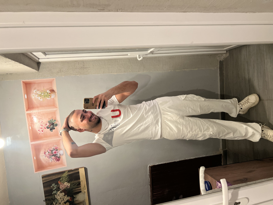The image displays a male individual taking a mirror selfie indoors in Shumata, Bulgaria