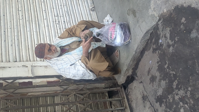 An elderly man sits on the ground beside a corrugated metal wall and concrete. He wears a brown outfit, a plaid shawl, and a brown patterned hat. A plastic bag filled with items sits next to him. He is holding something in his hands, possibly coins or a small object. The ground appears to be dirty and worn, suggesting an urban or possibly impoverished setting. The photo is taken from a slightly elevated angle.