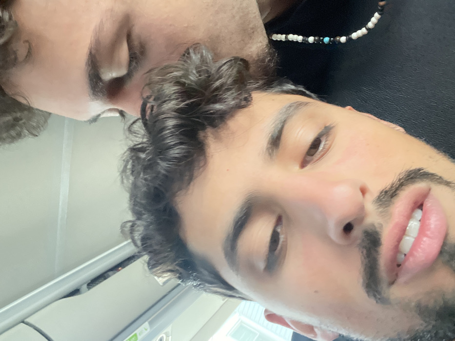 The image depicts two males inside a vehicle, likely in transit. The male in the foreground, with dark curly hair, a mustache, and goatee, looks toward the viewer. The second male, visible behind and to the right, has his eyes closed and is pressing his lips to the forehead/hair of the foreground male. He wears a necklace composed of white, black, and turquoise beads. The upper left of the frame shows the vehicle's interior paneling and a blurry external view of a light-colored building with siding. The specific location within New Brunswick, United States, is not identifiable from the visual information provided.