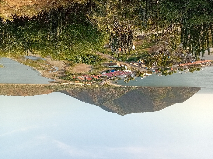 A landscape depicts a mountainous terrain with water stretching towards the horizon. A cluster of houses line the shore, situated between two bodies of water. Lush green vegetation, including cacti and trees, thrives on elevated ground. A clear sky occupies the lower portion of the image, contributing to a bright, natural ambiance.