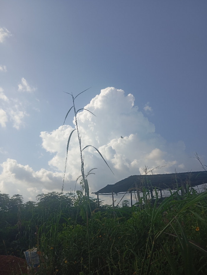 The image portrays an outdoor scene in a semi-rural or undeveloped area within or near Enugu, Nigeria. The upper portion of the frame features a bright blue sky dotted with scattered white cumulus clouds, including a large, prominent cloud mass on the right. The lower half of the image is dominated by dense, vibrant green vegetation, consisting of various tall grasses and what appear to be young corn or maize stalks, some bearing tassels. Small yellow flowers are visible amidst the foliage. In the midground, partially obscured by the vegetation, stands a rudimentary, open-sided shelter structure. This structure has a dark, sloped roof, likely corrugated metal, supported by thin, vertical poles. A line of green trees is visible beyond the vegetation to the left of the shelter. In the bottom left corner, a white sack, possibly containing agricultural supplies, is partially visible on the ground beside a small mound of reddish-brown soil. No human figures or discernible animal life are present in the scene.
