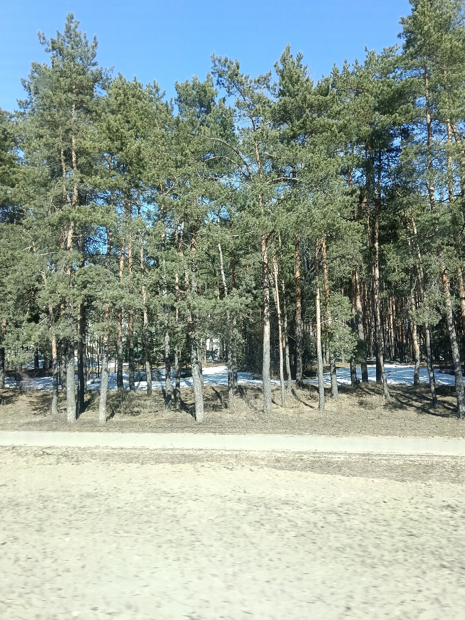 The image depicts a section of forest in the city of Vladimir, Russia. A dense row of tall pine trees dominates the middle ground, their green foliage contrasting with the bright blue sky visible above. Patches of snow are visible between the trees, indicating a late winter or early spring scene. A wide, sandy path runs horizontally across the foreground, seemingly separating the viewer from the forest. The ground between the path and the trees is covered with dry, brown vegetation. No people or other identifiable subjects or interactions are visible. The scene is static and captures the natural environment of a forest edge in an urban area.