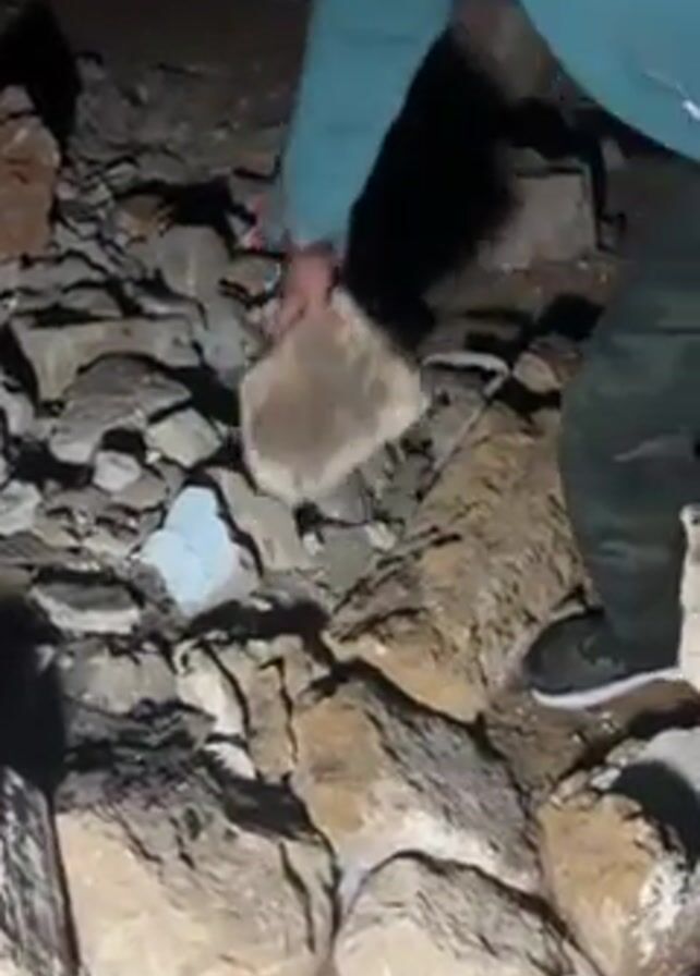 A man with glasses, a mustache, wearing a light blue hoodie, and camouflage pants, picks up a rectangular stone from a pile of rocks and soil