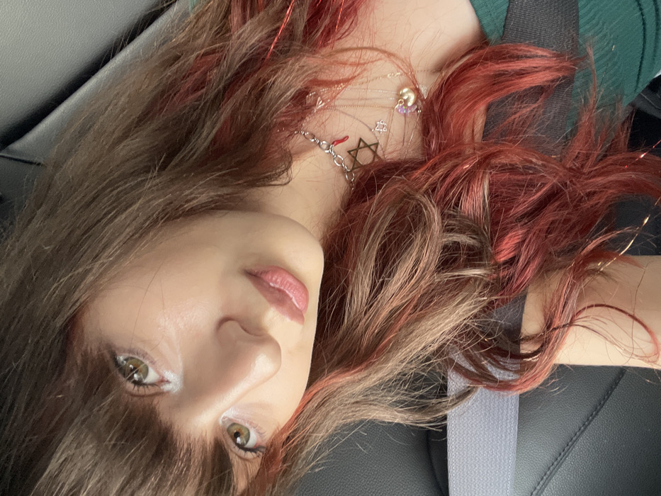 A fair-skinned person with light brown hair tinged with red hues, is angled towards the camera. The individual's eyes are hazel. Multiple necklaces adorn their neck, including one with a Star of David pendant. They are wearing a green shirt and are secured with a gray seatbelt. The interior of a vehicle, with black leather seats, serves as the background.