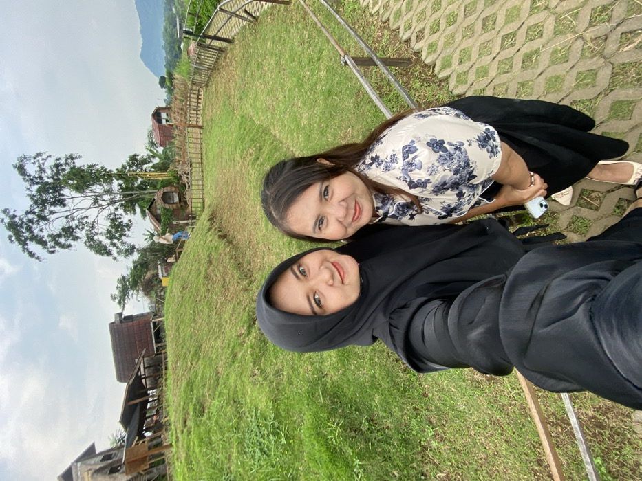 The image captures an outdoor scene in Tamiajeng, Indonesia, featuring two adult females in the foreground posing for a photograph