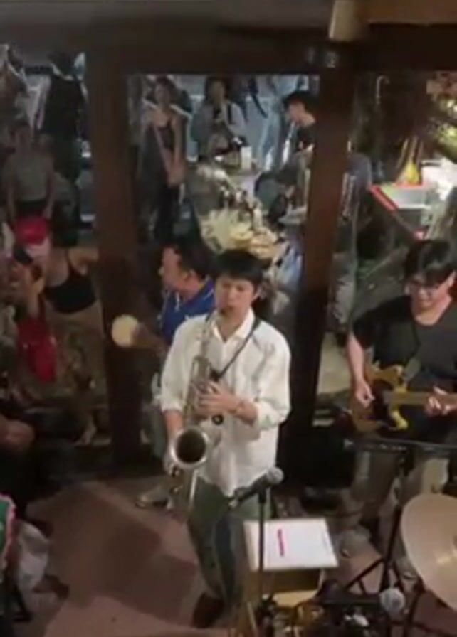 A man in a white button-down shirt and patterned pants plays the saxophone in front of a microphone. He is part of a band with a guitarist and a man playing a tambourine. A crowd of people are gathered around, some are standing, some are sitting, and some are dancing. The band is set up in what appears to be a bar or restaurant. The lighting is subdued. A street with car traffic is visible through the back door.