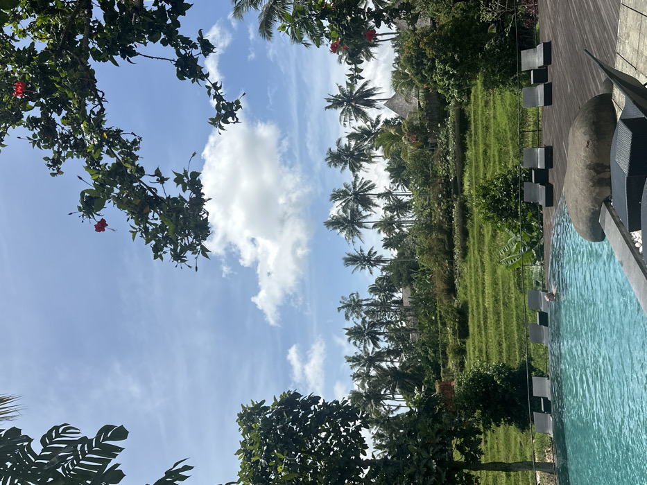 A serene outdoor scene showcases a blue sky with scattered white clouds, framed by lush tropical foliage. Palm trees line the horizon beyond a green field. A pool with clear water is partially visible, bordered by a wooden deck. The camera's upward angle captures the sky and vegetation, giving a sense of tranquility.