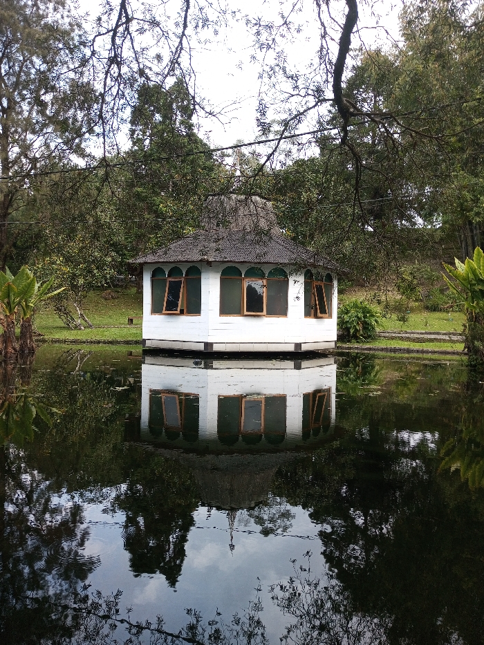 The image displays a white, octagonal building with a dark, conical roof, situated on a body of water in Ambositra, Madagascar. The structure features multiple windows with dark frames set within arched outlines; several windows are open, tilted inwards. A clear, inverted reflection of the building and its immediate surroundings is visible on the still water's surface, which contains minimal surface vegetation. Dense green trees and various forms of foliage line the banks around the water, extending into a heavily vegetated background under an overcast sky. Bare tree branches partially obscure the upper portion of the frame. No individuals, specific actions, or interactions are discernible within the scene.