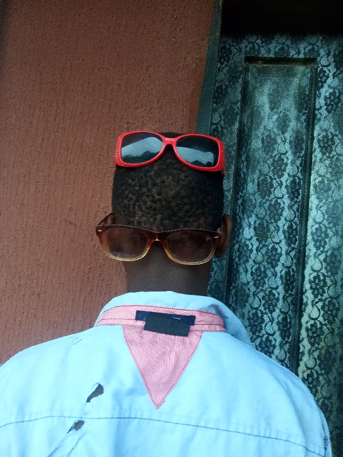 The image presents a rear-view, close-up perspective of an individual located in Asaba, Nigeria. The subject possesses short, dark, curly hair. Two pairs of sunglasses are observed: one pair with red rectangular frames and dark lenses rests on the crown of the head, while another pair with amber-colored frames and dark lenses is worn on the face, obscuring the eyes. The individual is wearing a light blue collared shirt. The shirt's collar features a reddish-pink triangular patch on the back, with a black tag positioned beneath it. Two irregular, dark-colored stains are visible on the upper back portion of the shirt. The immediate background to the left consists of a textured, reddish-brown wall. To the right, a vertical section of a dark teal or bluish-green surface is present, exhibiting a repeating embossed pattern, possibly floral or damask, characteristic of a door or decorative panel. A dark, narrow vertical line separates the two background elements. No specific actions or interactions are discernable beyond the individual's posture.