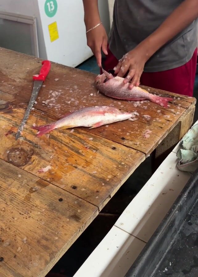 A person is cutting the head off of a red fish on a wooden cutting board. A second red fish lies next to it, already gutted. A large knife rests on the table. The person is wearing a grey t-shirt and red shorts. A white freezer is behind them. There is ice on the cutting board and on the floor. A black tray sits beside the table. The flooring is part white tile and part painted blue.