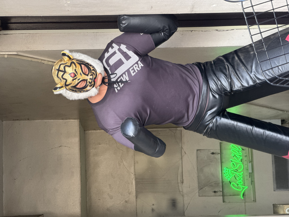 A single individual is centered within a narrow concrete passage or doorway, positioned in the city of Setagaya, Japan. The person is wearing a gold and black tiger-themed wrestling mask with white fur trim, secured by black ties. They are dressed in a dark grey short-sleeved athletic shirt with "NEW ERA" printed in white diagonally across the chest, overlaying a larger white graphic. Black padded forearm guards are worn on both arms. The lower body is clad in shiny black, likely leather or pleather, padded pants with a red line accent visible at the waist. The individual stands in a wide-legged stance with bent arms, forearms roughly parallel to the ground. In the background to the lower left, a green neon sign displaying the text "Good Skill" under a crown icon is mounted on a light-colored, worn wall exhibiting cracks. A dark, grid-patterned object partially occupies the lower right foreground.