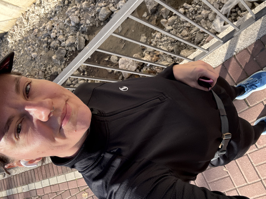 A female subject is depicted from a slightly elevated perspective, looking towards the camera, in Rafailovići, Montenegro. She has fair skin, visible facial pores, light eyes, and a small ring piercing her left nostril. A white wireless earbud is present in her left ear, and the brim of a red baseball cap is visible at the top of her head. She wears a black, quarter-zip Champion brand athletic shirt, black leggings, a grey belt with a bronze-colored buckle, and blue athletic shoes with white soles. Her right hand, displaying short, neat nails, holds a pink-cased smartphone near her hip. The subject stands on a sidewalk composed of red and beige interlocking pavers; a dried leaf is visible on the pavement. To her right, a grey metal railing with vertical bars separates the sidewalk from a lower rocky creek bed. The creek bed contains numerous light-colored rocks and pebbles, with a narrow stream of dark water flowing through it. A concrete retaining wall forms the far bank of the creek. The scene is illuminated by direct sunlight, casting clear highlights.