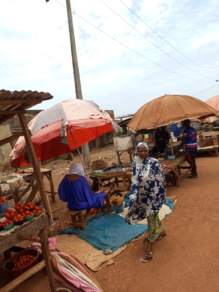 n outdoor market scene in Idah, Nigeria, located at coordinates 7.106 latitude and 6.729 longitude. The market is situated on a dirt road, with several stalls set up under umbrellas. There are three women present. One woman, wearing a blue dress, is seated at a stall with red tomatoes displayed on a wooden table. Another woman, wearing a blue and white patterned head scarf and dress, is walking towards the camera. A third woman, wearing a black and white patterned head scarf and dress, is standing behind a stall. The stall has various items displayed on a table under an umbrella. A man wearing a blue and white striped shirt is standing behind a stall, holding a black bag. There are power lines running overhead and a wooden structure in the background. The environment is dusty and there are various items scattered on the ground.