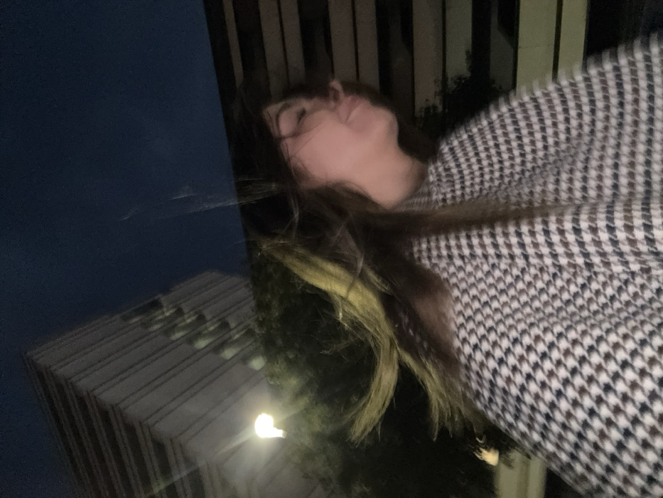A woman in a houndstooth coat is the main subject. Her dark hair with light highlights is visible. A tall building is reflected in what appears to be a window, positioned against a dark blue evening sky. A streetlight shines in the reflection. The image has an abstract and blurry aesthetic, suggesting movement or a low-light setting.