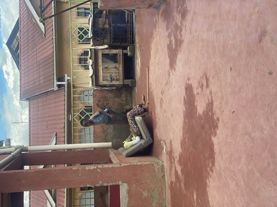 The image depicts an outdoor rooftop scene in a residential area of Nairobi, Kenya, under a partly cloudy sky. In the foreground, a large, flat, reddish-brown concrete or tiled surface, appearing partially wet with darker moisture patches, extends across the frame. A small, clear plastic bottle and a light-colored wooden stick are visible on this surface. Two young males are present. On the left, a male child is seated on a light gray upholstered object, possibly a car seat or armchair section, which is propped against a reddish-brown concrete wall. He wears a yellow long-sleeved shirt underneath a graphic t-shirt and multi-colored patterned trousers, with bare feet. His posture is relaxed. To his right and slightly behind him, a second male child stands, wearing a light blue graphic t-shirt and dark trousers. His body is slightly bent forward, suggesting movement or observation. Behind the children, a low, weathered concrete wall supports a light green metal railing. Beyond this railing, the scene shows the exterior of adjacent residential buildings. These structures feature light-colored (likely beige or yellow) walls with multiple windows, some adorned with decorative grilles, and prominent reddish-brown corrugated metal roofs. A television antenna is visible on one of the distant rooftops against the sky. Two animal enclosures are positioned on the low wall: a wooden hutch with a mesh front and small door, raised on concrete blocks, and a smaller, rusted metal cage. A white downspout pipe runs vertically along the reddish-brown concrete wall on the left.