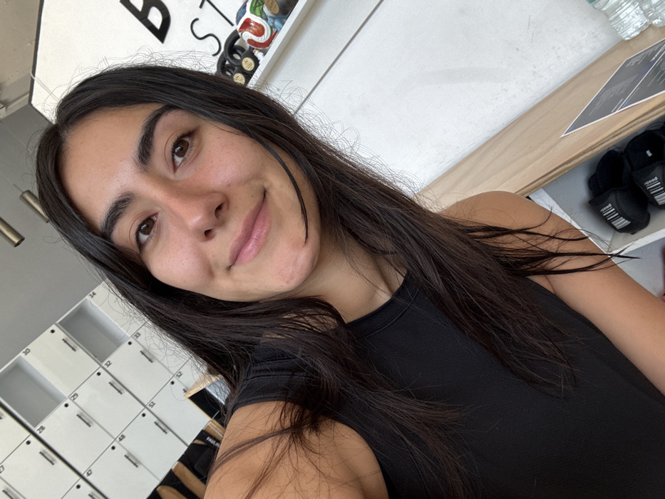 A young woman with long, dark hair smiles gently towards the camera. She wears a black tank top. The background suggests a gym or fitness studio. Lockers line the wall to her left, while a shelf with items, including shoes and water bottles, is visible above and to her right. A sign with bold lettering is partially visible in the upper left corner. The image is well-lit with a casual, candid feel.