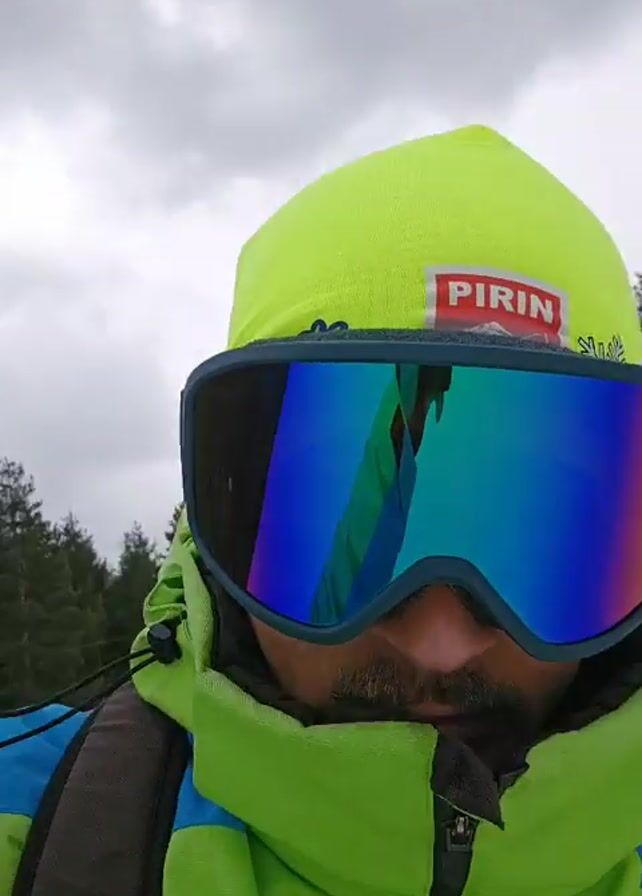 person skiing on a snowy slope. The person is wearing a bright green and blue ski jacket, a yellow beanie with the word "PIRIN" on it, and large ski goggles that reflect the environment. The camera is positioned from the skier's perspective, capturing the view of the slope ahead. The slope is mostly white snow, with some patches of dirt visible on the sides. In the distance, other skiers can be seen, and the edges of the slope are lined with evergreen trees. The sky is overcast. The skier is moving downwards, capturing the motion and the surrounding environment.
