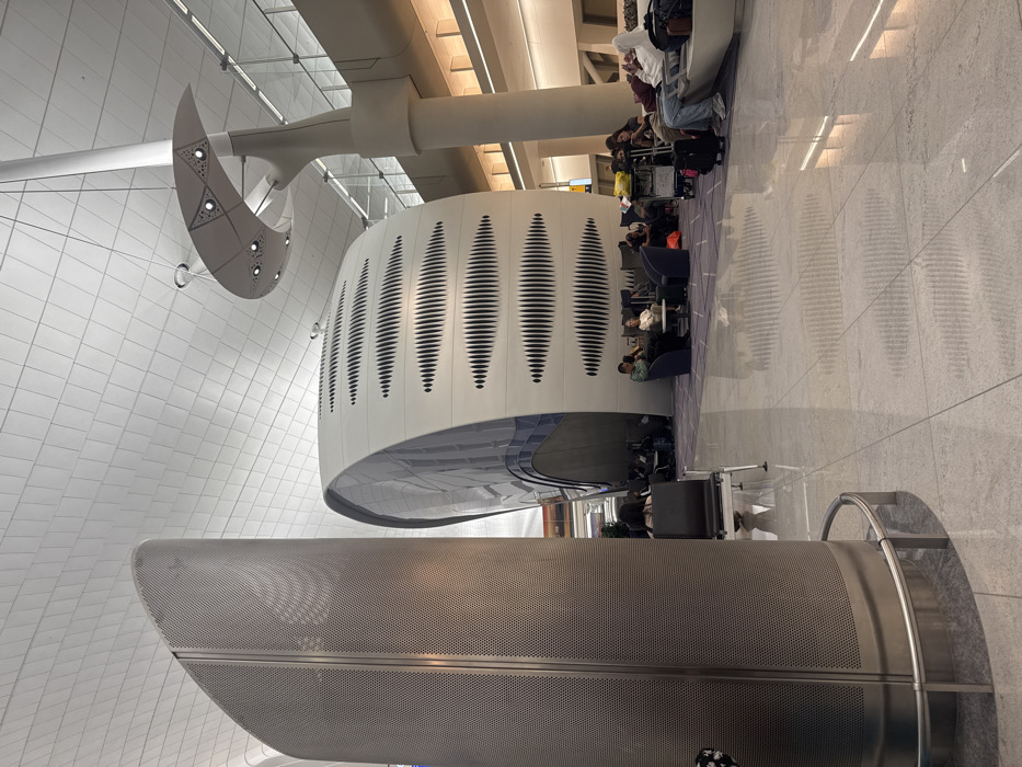 An interior shot depicts a modern airport terminal or expansive public waiting area, identified as being in Al Matar, United Arab Emirates. The scene is dominated by contemporary architectural elements under a high, paneled white ceiling with integrated lighting. In the foreground to the left, a tall, curved, perforated metallic gray column stands vertically, extending out of frame at the top. Its surface is uniformly perforated with small circular holes, and its base features a horizontal metallic safety rail. Centrally, a large, distinctive, white, pod-shaped structure with rounded edges is prominent. It features multiple horizontal bands of dark, wavy, vertical lines as decorative or functional elements. A large, curved glass panel forms a window or entrance on its left side, revealing a dimly lit interior. To the right of the pod structure, a lounge area is set on a dark purple carpet. Several individuals are seated in blue or purple upholstered armchairs around small, light-colored tables. Two men are conversing, while others are resting or using electronic devices. Further right, a longer, light-colored bench seating area is occupied by more individuals. One person in a white hoodie and blue jeans is reclined with their feet elevated. Several pieces of luggage, including rolling suitcases, are visible near the seated individuals and a yellow luggage cart. The flooring throughout the visible area is composed of large, polished, light-gray tiles, which exhibit significant reflectivity, mirroring the ceiling, structures, and lighting. In the background, large, light-colored support columns extend to the ceiling, and a glass-paneled railing for an upper level is visible. A unique, white, semi-circular lighting fixture with triangular cutouts and recessed lights hangs from the ceiling on the right, supported by a tree-like column structure. The overall environment appears clean, well-lit, and functional.