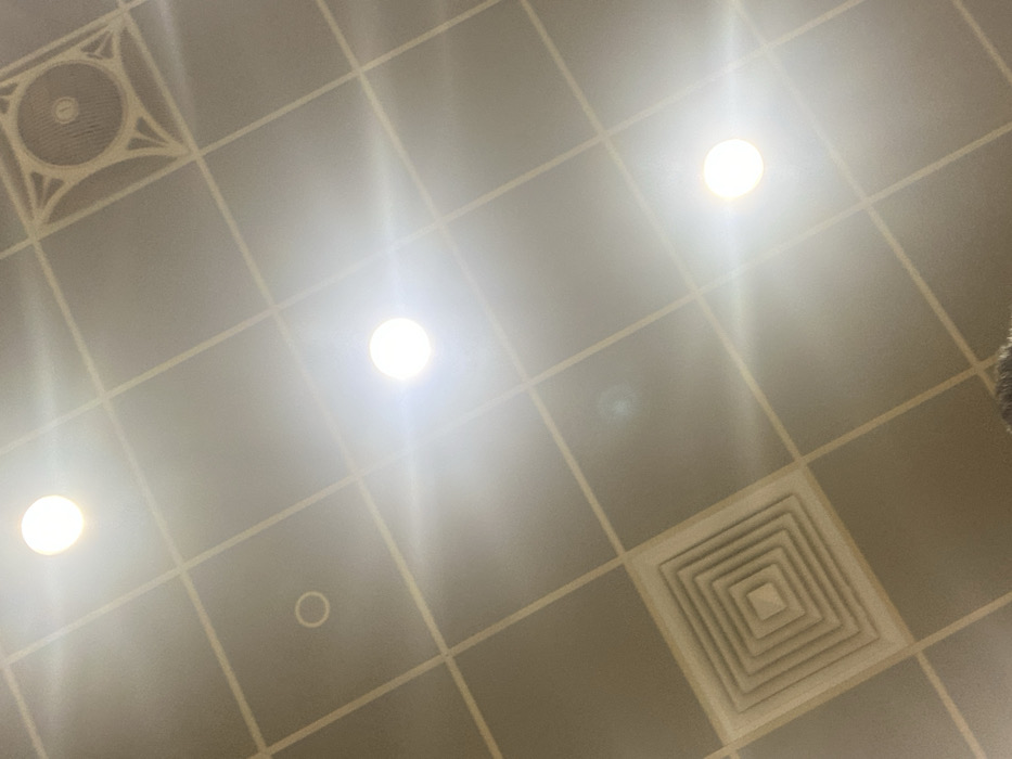 The scene depicts an interior ceiling, located in Rukn ad-Din Municipality, Syria, viewed from a low angle. The ceiling is a suspended grid system composed of light-colored lines forming light gray square panels. Three active, circular recessed light fixtures are prominent, emitting bright white light with notable lens flare effects. In the upper right portion of the frame, a square panel houses a circular grille, consistent with a speaker, framed by a decorative square pattern. A square air vent with concentric louvered layers is visible within a panel in the lower left. A faint, small circular outline is discernible on a ceiling panel in the mid-left area. The top portion of a human head, showing dark hair, is present along the bottom edge of the frame, indicating the perspective.