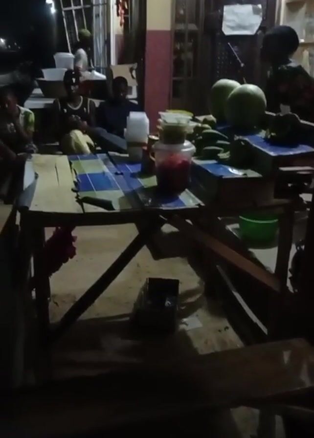 The video depicts a nighttime scene outdoors, possibly a roadside eatery or vendor stall. Several people are present, some sitting around a makeshift wooden table. On the table are a variety of items, including fruits (possibly coconuts and mangoes), containers of prepared food or condiments, and what appears to be a knife. The lighting is dim, but the scene is illuminated by light coming from a building behind the table. The overall environment appears informal and bustling with activity.