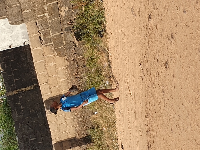 A child wearing a blue shirt and shorts stands on a sandy path, appearing to hold an object in their right hand. The path is adjacent to a wall made of rectangular blocks. Vegetation grows along the edge of the path near the wall. The lighting suggests a bright, sunny day. The orientation of the image is vertical, showing a full view of the scene from the child to the wall and the path.