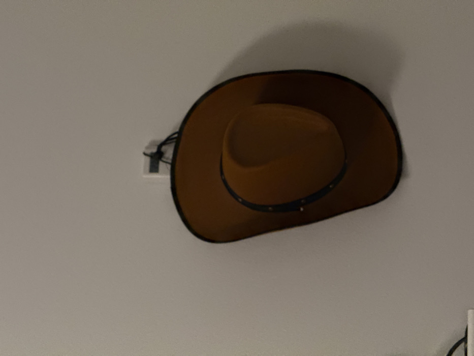 The scene is an interior view, located within Frederiksberg, Denmark, depicting a domestic or private space as no external city identifiers are present. A single brown wide-brimmed felt hat is the primary subject, centrally positioned and suspended against a plain, light-colored wall. The hat features a molded crown with a central indentation and a dark band, likely black, decorated with metallic studs. It is hung by a black cord or loop from a small, light-colored rectangular fixture mounted on the wall, possibly a hook or a utility device. A soft shadow from the hat is visible on the wall to the right. No individuals are present. A dark, out-of-focus object or cable is partially visible in the bottom-left corner.