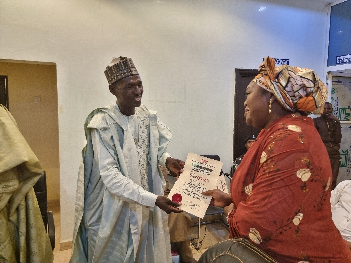 two people inside a room, possibly an office, located in Maiduguri, Nigeria at the coordinates (latitude: 11.832, longitude: 13.143). A man is standing on the left, wearing a light blue, long-sleeved robe and a brown cap. He is handing a white certificate with a red seal to a woman seated on the right. She is wearing a rust-colored robe, adorned with brown and orange floral patterns, and a patterned, orange and brown head covering. Another person, partially obscured by the woman, is seated behind her, wearing a black and blue uniform. There are other people and objects in the background but they are not clearly visible. The room appears to have white walls and a light-colored floor.