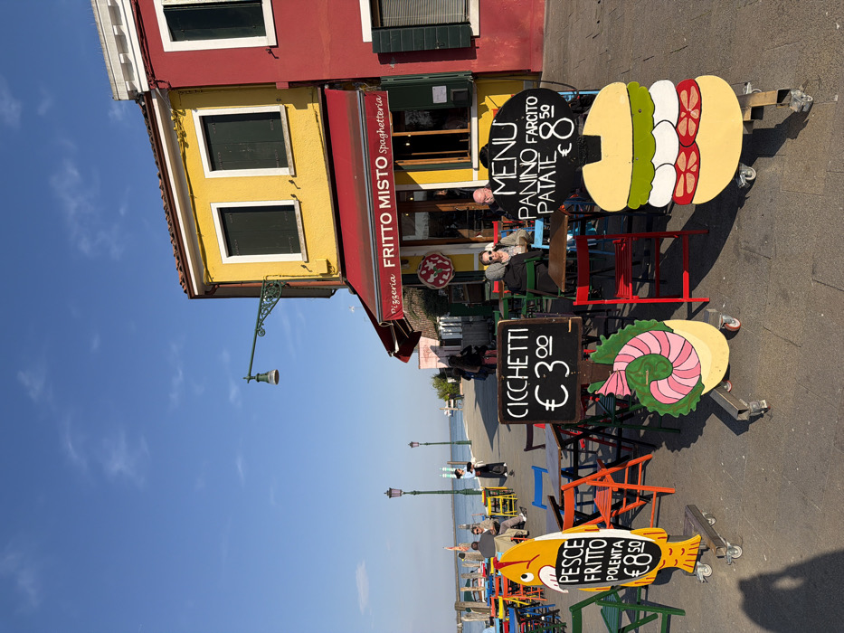 - "n outdoor dining scene on the island of Burano in the Venetian Lagoon, Italy, positioned along a canal under a clear blue sky" by FM-rE8HA3, licensed under CC BY 4.0