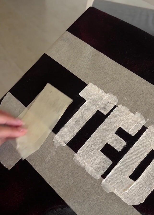 A close-up shot shows a person’s hand carefully removing pieces of masking tape from a dark-colored surface, likely wood, which has been painted with white stripes and the word "TEAM