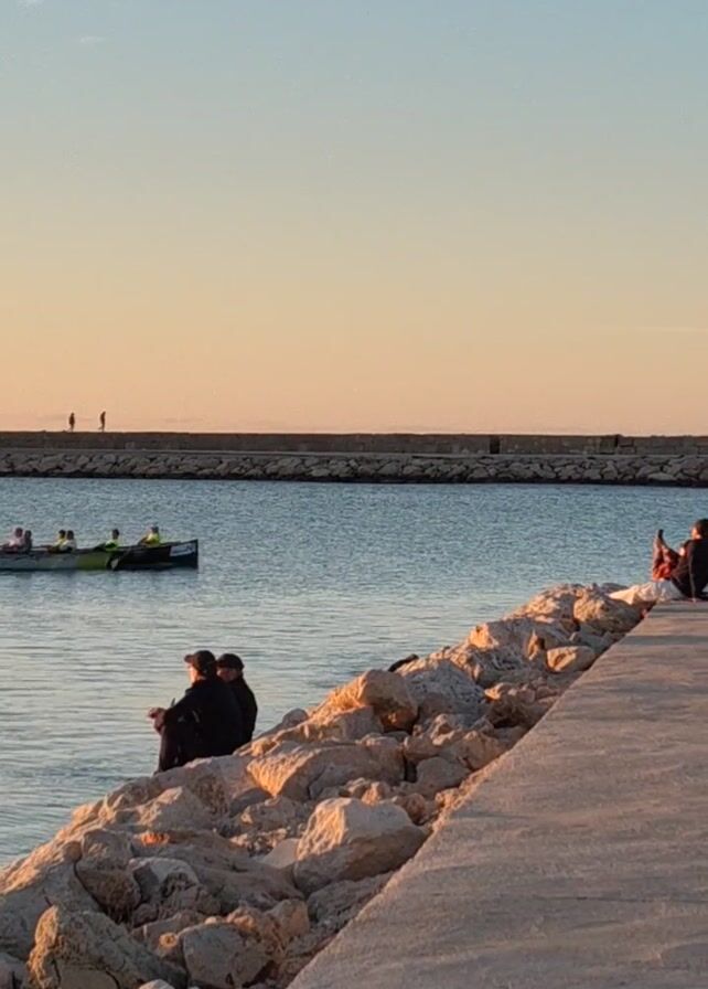 The video presents a wide shot of a coastal scene, taken from a perspective slightly tilted to the right. The frame is divided into three primary sections: the sky, the water, and the embankment/breakwater. The sky occupies the left portion, displaying a gradient of pale blue at the top fading into a soft orange/pink near the horizon. The water fills the central area. A long, narrow boat, likely a rowing scull, is visible with multiple individuals on board, each wearing bright green tops. The boat appears to be moving slowly, with at least one person rowing. On the right side, an embankment or breakwater composed of large stones is shown. Two people are sitting near the edge of the embankment. Another person is standing lower down, closer to the water and facing the boat. The embankment surface is concrete. The overall lighting suggests either sunrise or sunset, with warm light illuminating the stones of the breakwater. No sound is audible.