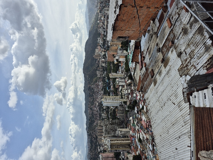 A high-angle perspective shows a city sprawling beneath a partially visible rooftop. Clouds fill the sky on the left, contrasted by a mountain range in the background. The city blends high-rise buildings with densely packed residential areas, creating a diverse urban landscape. The rooftop in the foreground features a mix of corrugated metal, brick, and concrete, displaying varying states of wear and texture.