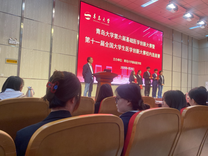 n auditorium at Qingdao University, located at latitude: 36.077, longitude: 120.413 in Qing Dao Shi, China. The stage is decorated with a large red banner with the words "Qingdao University Sixth Basic Medical Science Innovation Competition Eleventh National Student Medical Innovation Grand Prize Award Ceremony" written in Chinese. There are seven people standing on the stage, including a presenter and six award recipients. The presenter is a man wearing a black suit. The award recipients are a mix of men and women, and they are all wearing formal attire. The audience is seated in rows of brown chairs. The room is brightly lit, and there are numerous spotlights. The presenter stands behind a lectern with a microphone, and an award recipient holds a large red certificate. The audience is comprised of several people of various ages and genders, mostly students, attending the ceremony. A man sitting at the front of the audience is wearing a black jacket. Two women, one with her hair pulled up and held with a colorful hair clip, are sitting in the front row. The image focuses on the audience members, with the stage and speakers in the background. The scene is formal and celebratory.