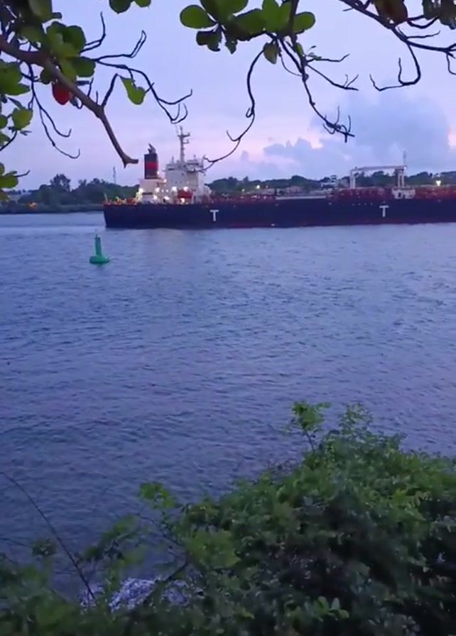 large black and red ship, possibly a tanker, moving across a body of water under a partly cloudy, twilight sky. The ship has a white superstructure with a red and black chimney. The letter "T" is visible multiple times on its hull. The camera view is partially framed by branches and leaves of a tree or bush, and green foliage is also visible at the bottom of the frame, suggesting the viewer is near the shore. A green navigation buoy is visible in the water closer to the shore. The water is dark blue with slight ripples, and the overall scene has a tranquil, dusky ambiance.