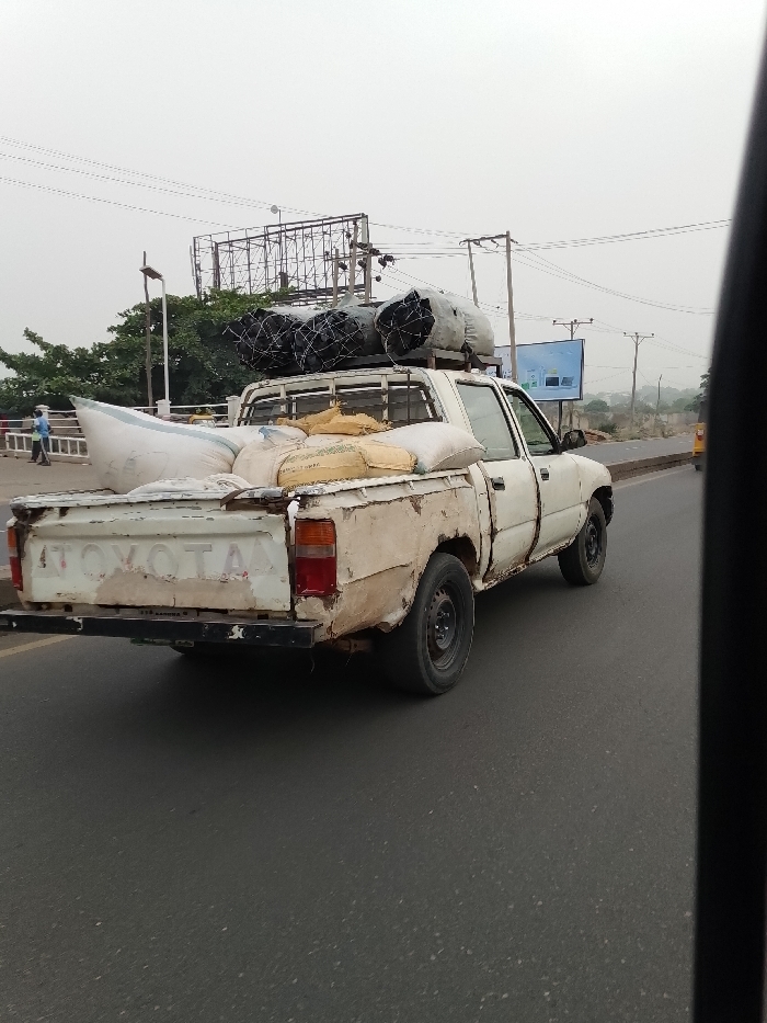An aged, white Toyota pickup truck is heavily laden with sacks and wrapped objects on its roof rack. The vehicle shows signs of wear and rust along its body. It travels on an asphalt road, likely a highway, with overhead power lines and distant buildings and billboards in the background. The image has been taken from inside a vehicle with the door frame in the far foreground, possibly while moving.