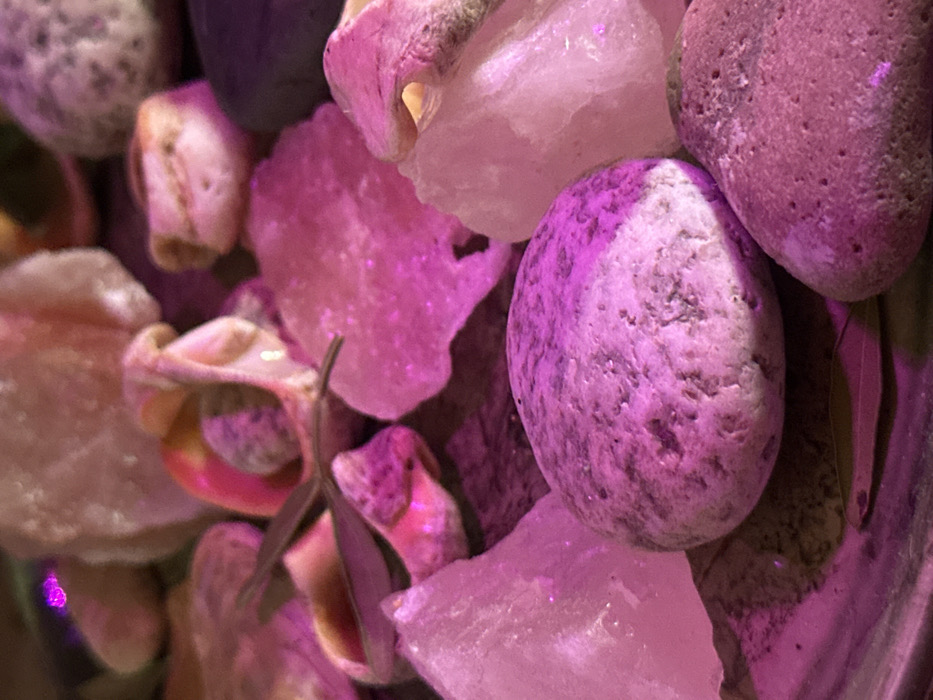 An assortment of pebbles, shells, and clear crystals are clustered together. The pebbles vary in texture, with some appearing smooth and others porous. The shells show delicate pink and white hues. Jagged, translucent crystals reflect light unevenly, adding brightness. The overall color palette is dominated by shades of pink, mauve, and purple, creating a soft and textured composition.