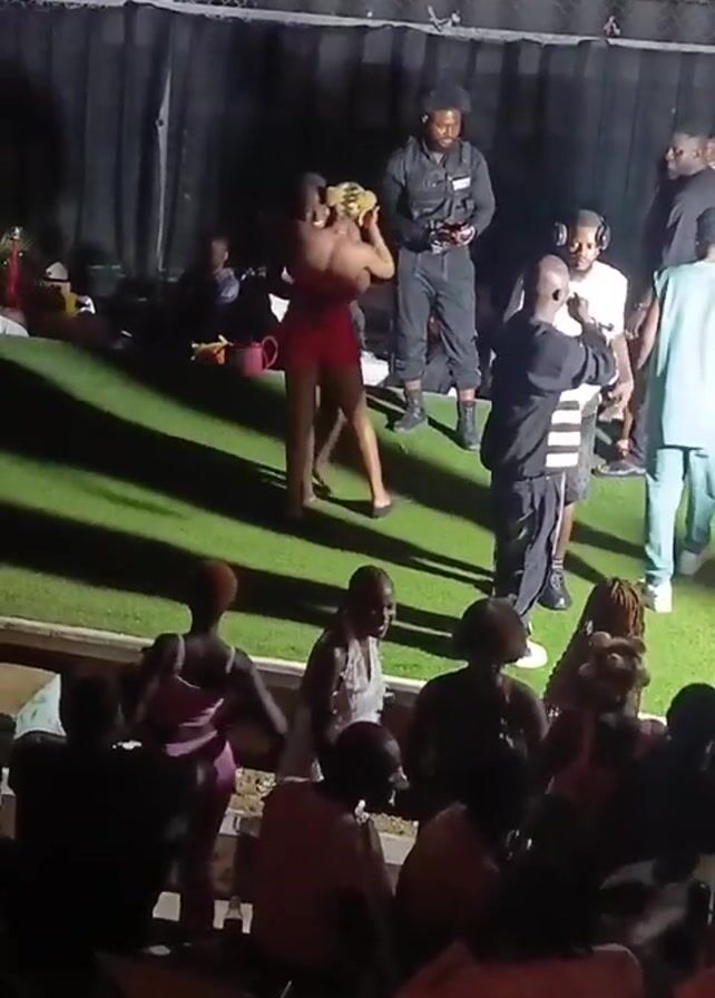 group of people gathered at an outdoor event at night. The scene appears to be a party or celebration taking place on a patch of artificial turf. A woman in a red outfit is dancing in the center of the space, interacting with other individuals. Several people are standing or walking around. A man dressed in what appears to be a security uniform with tactical gear stands observing the scene. Other people are seated on chairs. The background features a dark fence. Overall, the video captures a social gathering in an outdoor setting at night.